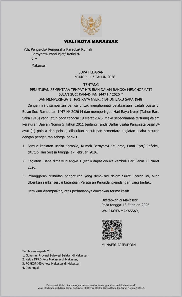Surat edaran yang ditandatangani Wali Kota Makassar, Munafri Arifuddin, tersebut mengatur penghentian sementara operasional sejumlah usaha hiburan mulai 17 Februari hingga 23 Maret 2026 sebagai bentuk penghormatan terhadap umat beragama yang menjalankan ibadah.